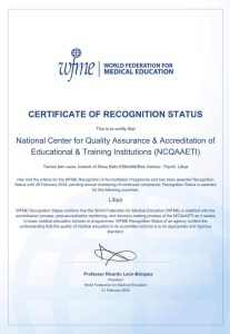 في إطار جهود متواصلة من وزارة التعليم العالي والبحث العلمي وبدعم من دولة السيد رئيس حكومة الوحدة الوطنية توجت بحصول مركز ضمان جودة واعتماد المؤسسات التعليمية والتدريبية على الاعتراف الدولي من قبل الاتحاد العالمي للتعليم الطبي (WFME) لمدة (10) سنوات، وبذلك يتوجه معالي الوزير الدكتور عمران القيب بالشكر والتقدير للسيد مدير المركز ولكل الفرق الفنية التي أعدت ملف المركز وفق متطلبات الاتحاد، وإلى وكليات الطب التي ساهمت في تجهيز ملف المركز وهي: كلية الطب بجامعة طرابلس، كلية الطب جامعة الزاوية، كلية الطب جامعة مصراتة، كلية الطب جامعة سرت، كلية الطب بالجامعة الليبية الدولية للعلوم الطبية، وشكر خاص لكلية الطب بجامعة بنغازي التي استقبلت فريق تدقيق المركز صحبة فريق تدقيق الاتحاد العالمي للتعليم الطبي (WFME) والتي مثلت كليات الطب في ليبيا خير تمثيل.